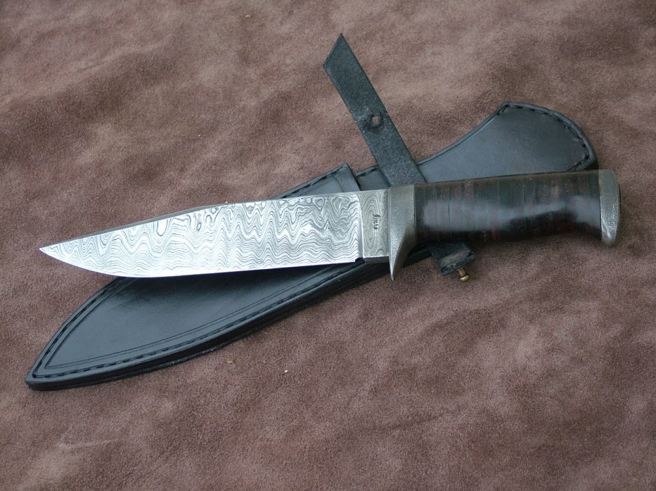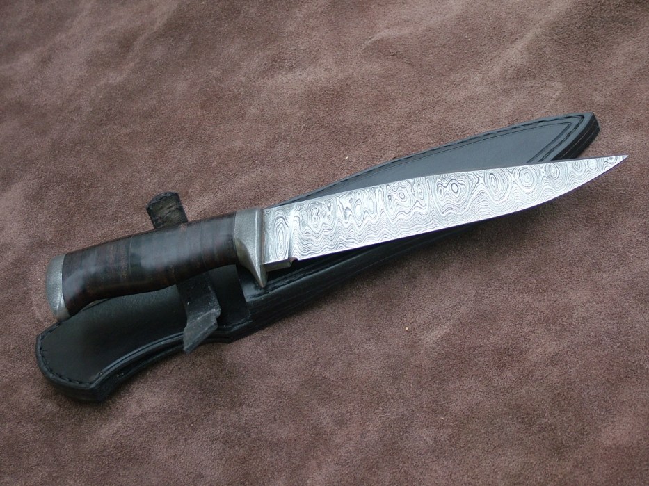 Damaškový Bojovník – damašok – 550 vrstiev.celá dl:310mm,čepel:170mm.patinovaná záštita a zadná hlavica.rukovat koža.kožené púzdro.